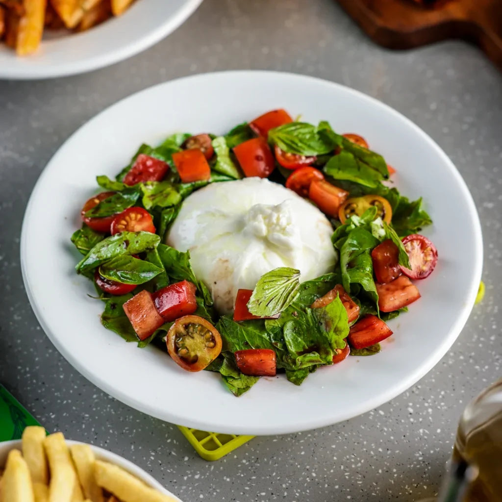 Balsamic marinated cherry tomatoes, basil and rocket leaves