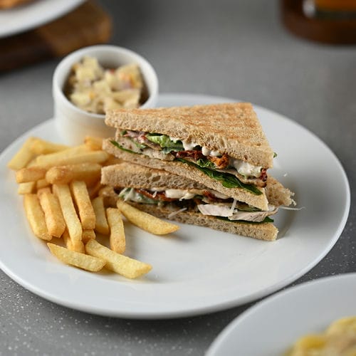 Grilled chicken, shredded romaine, fresh spinach, oven-dried tomatoes and parmesan (served with a small pasta salad and...