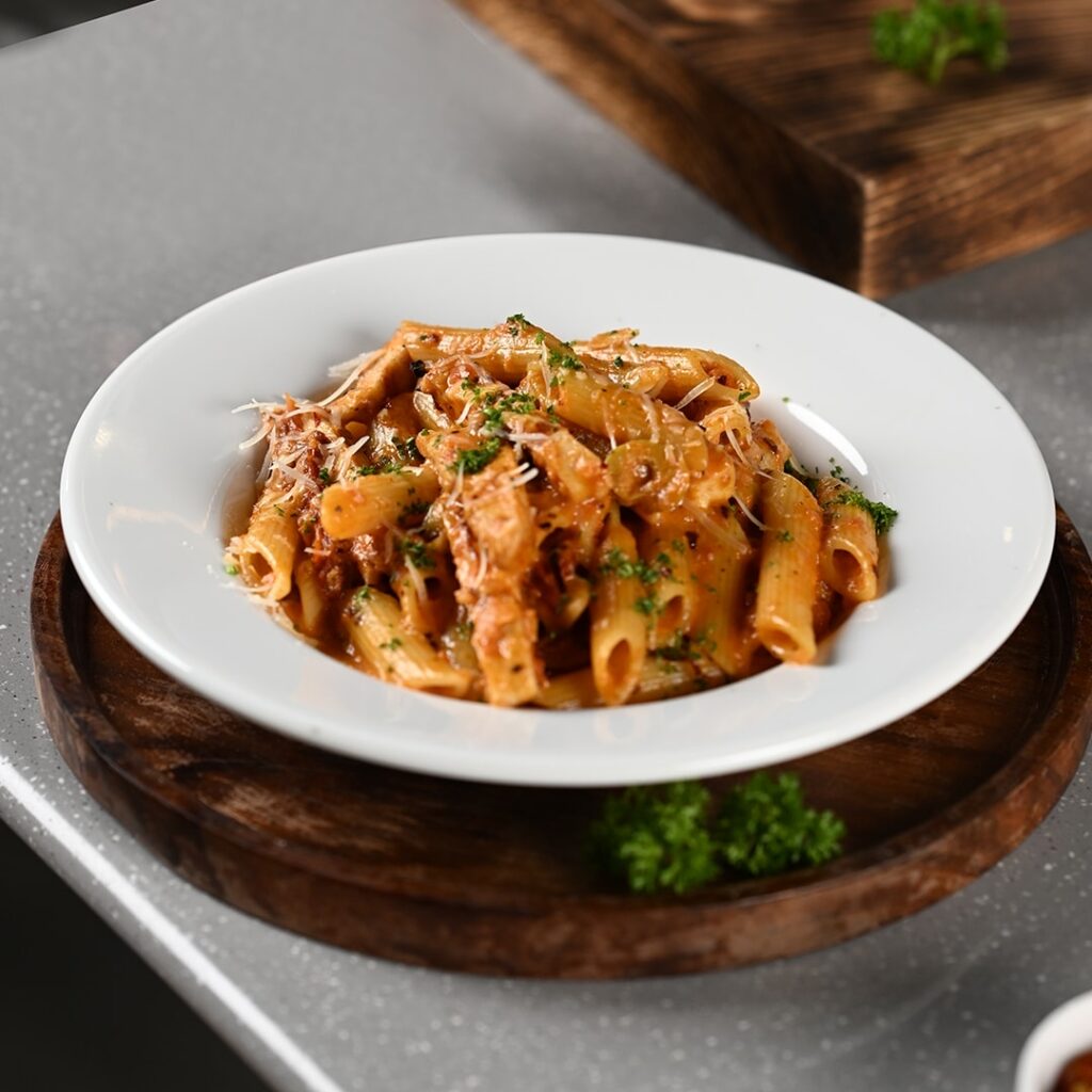 Grilled chicken with spicy creamy tomato sauce, roasted tomatoes, olives and parmesan