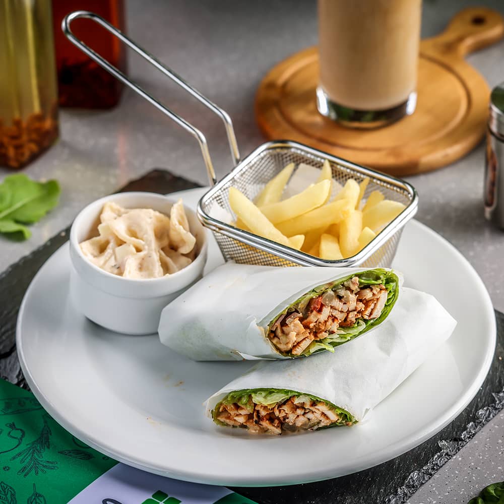 Lebanese style grilled chicken with salad and garlic aioli in a spinach tortilla