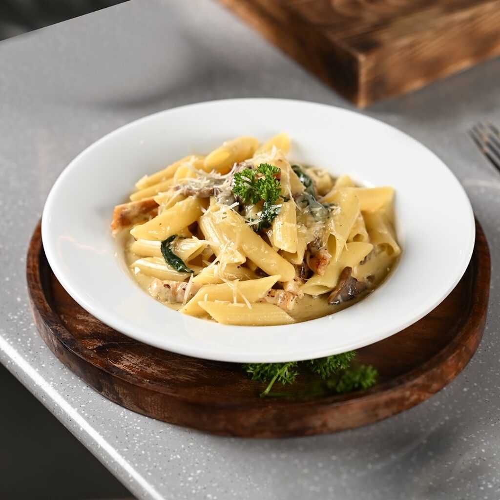 Grilled chicken, mushrooms, roasted garlic and spinach with parmesan cream sauce