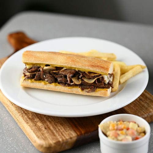 Thinly sliced beef tenderloin sautéed with fresh mushrooms and onion, topped with buffalo mozzarella on a soft...